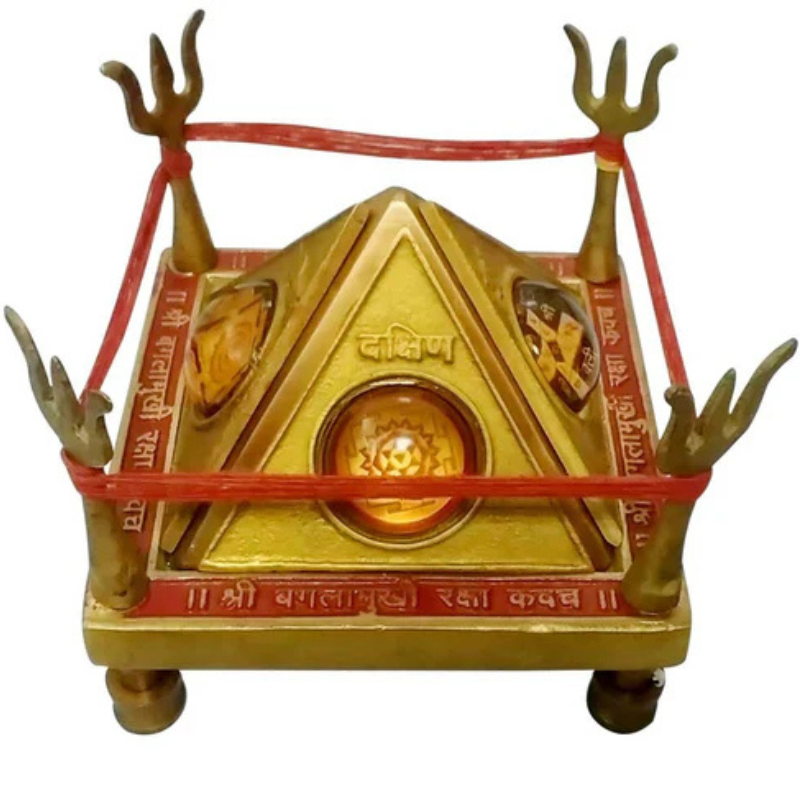 The Baglamukhi Raksha Kavach Chowki Yantra is a sacred and powerful spiritual instrument designed to protect devotees from enemies, negativity, and harmful influences. Crafted in a pyramid form and surrounded by four divine tridents (Trishools), this Chowki is dedicated to Goddess Baglamukhi, one of the ten Mahavidyas known for her immense protective and spiritual powers. Worshipping this Yantra provides divine shielding against obstacles, disputes, and ill intentions, while ensuring peace and prosperity in your surroundings.
